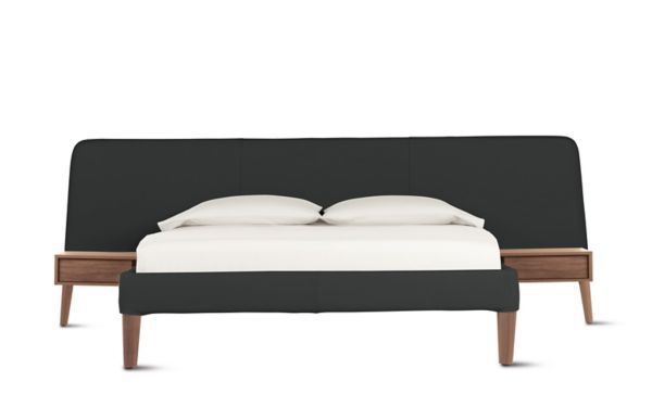 BEDS, Kiln-dried, corner-blocked alder hardwood frames; FSC-certified plywood headboards; oak or walnut legs; birch slats with beech veneer; polyurethane foam padding; removable slipcovers in fabric or leather. CASEGOODS, oak or walnut veneer over MDF; vacuum-closing drawer glides; leveling floor glides.
